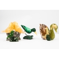 MALACHITE MODEL OF A WADING BIRD with metal wire legs on a malachite base representing water; and FOUR OTHER VARIOUS HARDSTONE CARVINGS OF BIRDS (5)