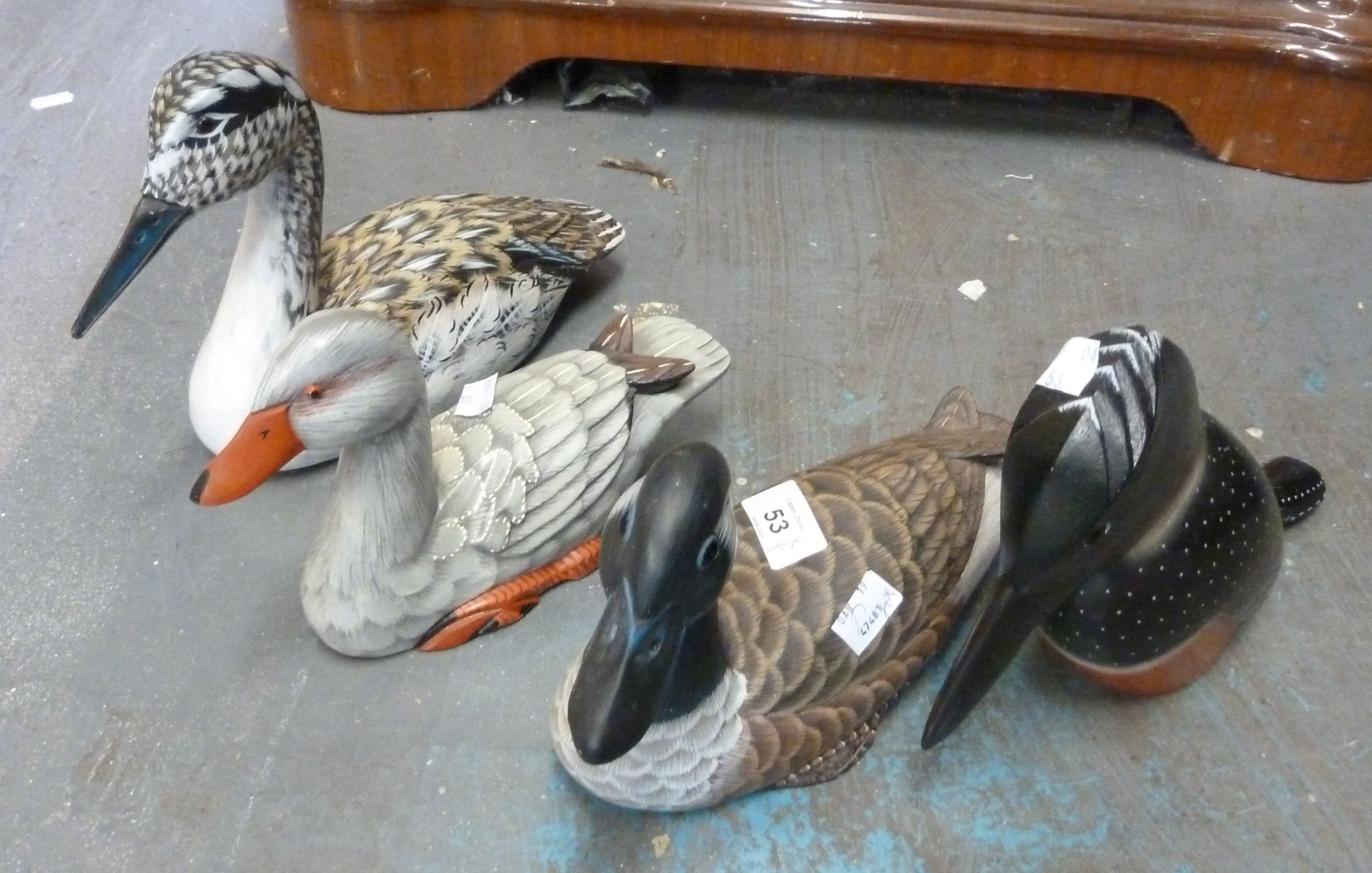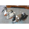 THREE MODERN HAND PAINTED WOODEN FAUX DUCK DECOYS ALSO A MODERN SOUTH AFRICAN WOODEN KINGFISHER (4)