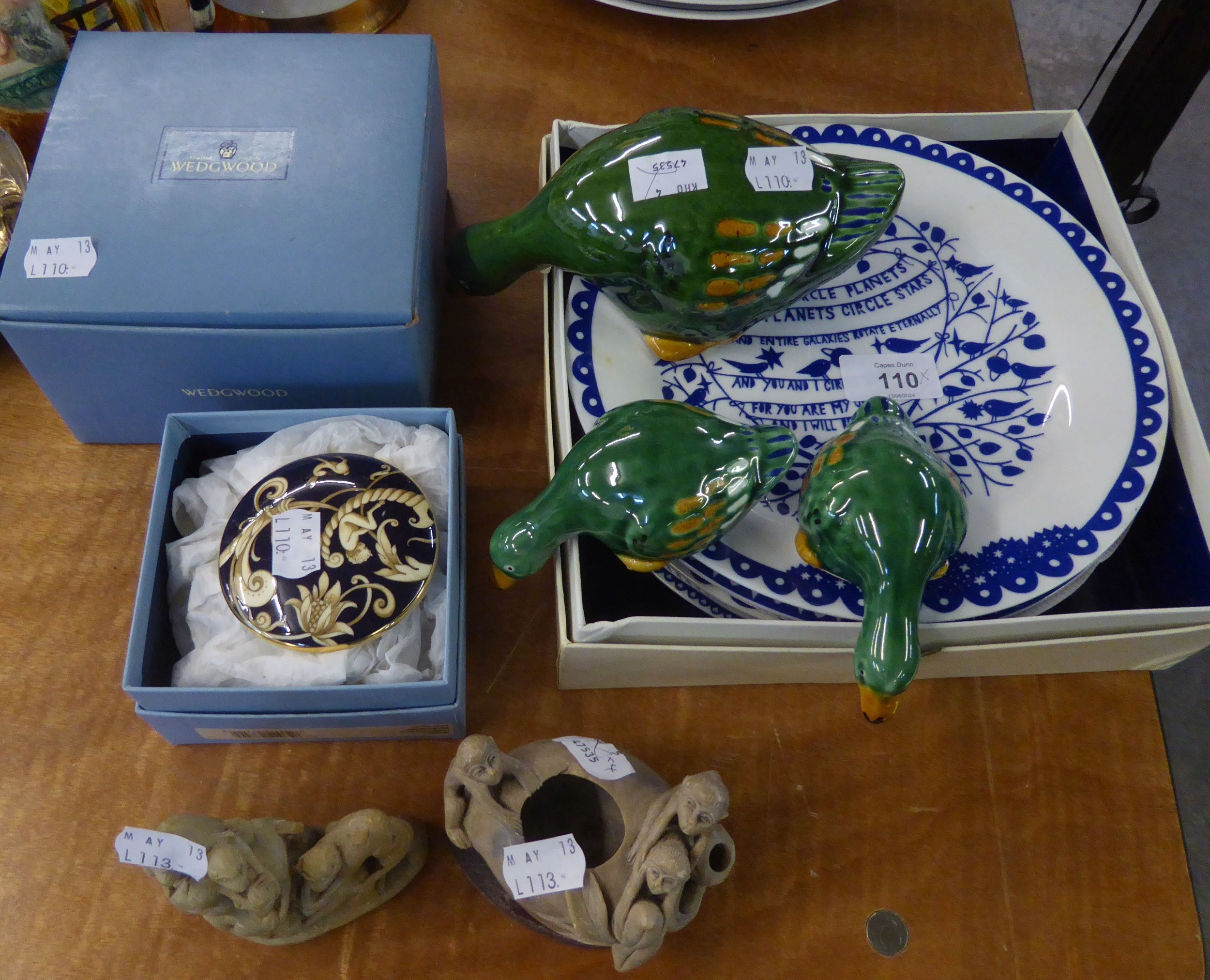 BOXED SET OF FOUR ROB RYAN DESIGNED 'MADE IN CHINA' FOUR SEASONS PORCELAIN PLATES, together with TWO MODERN BOXED WEDGWOOD 'CORNUCOPIA' PORCELAIN LIDDED BOXES and THREE REDUCTA (London) CERAMIC 'EDGE of SHELF' DUCKS