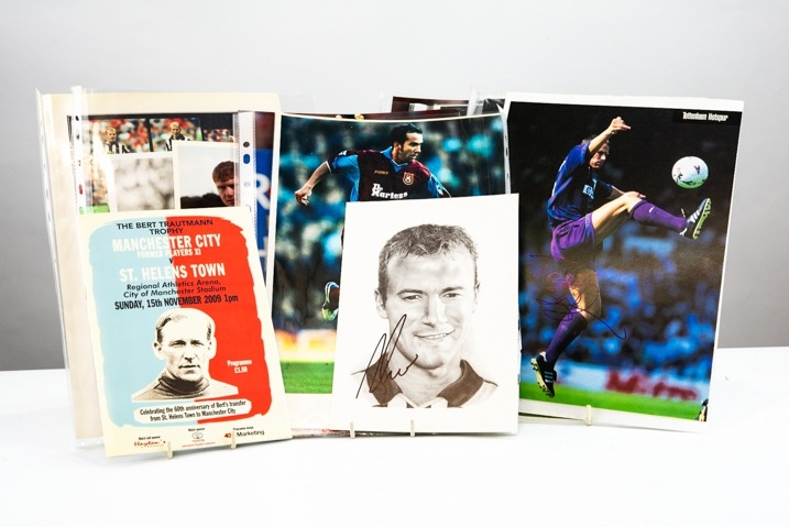 EIGHT AUTOGRAPHED COLOUR AND BLACK AND WHITE IMAGES OF FAMOUS FOOTBALLERS, signed mainly in black felt-tip, to include Alan Shearer x2, Teddy Sheringham, Paul Scholes, Peter Reid, Sol Campbell, etc; and a COPY OF THE PROGRAMME/SOUVENIR OF THE BERT TRANTMAN TROPHY FRIENDLY MATCH, 15/11/2009