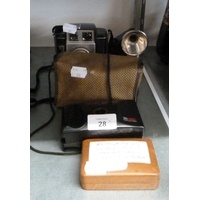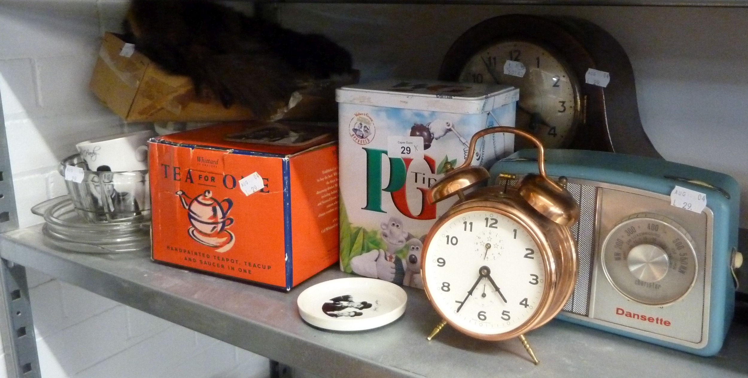 AN INLAID MAHOGANY NAPOLEONS HAT SHAPED MANTEL CLOCK, A DANSETTE RETRO PORTABLE RADIO, AN ALARM CLOCK, VARIOUS PYREX DISHES, TEA-FOR-ONE TEAPOT, VINTAGE FUR STOLES ETC....
