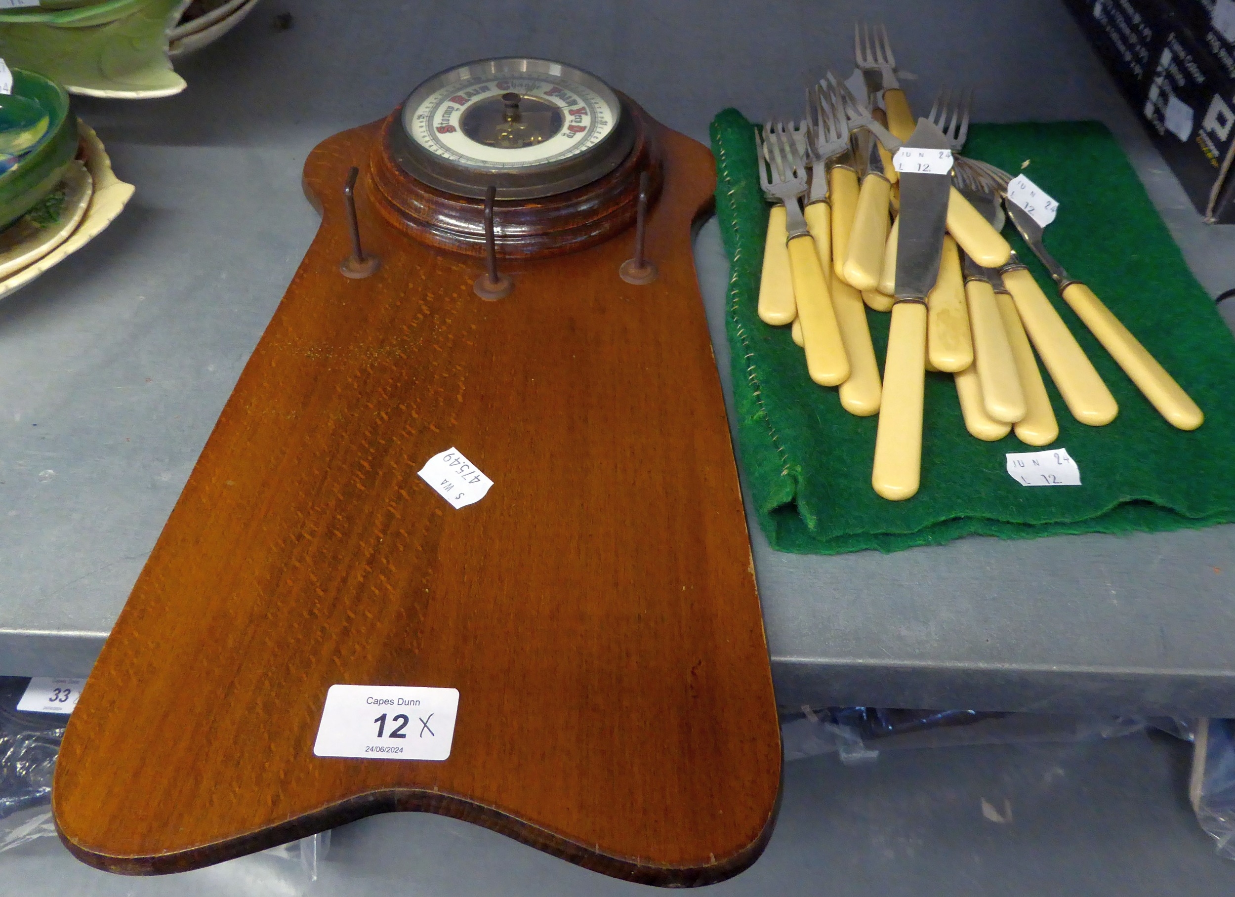 OAK WALL HANGING BAROMETER AND A SET OF 18 FISH KNIVES AND FORKS