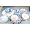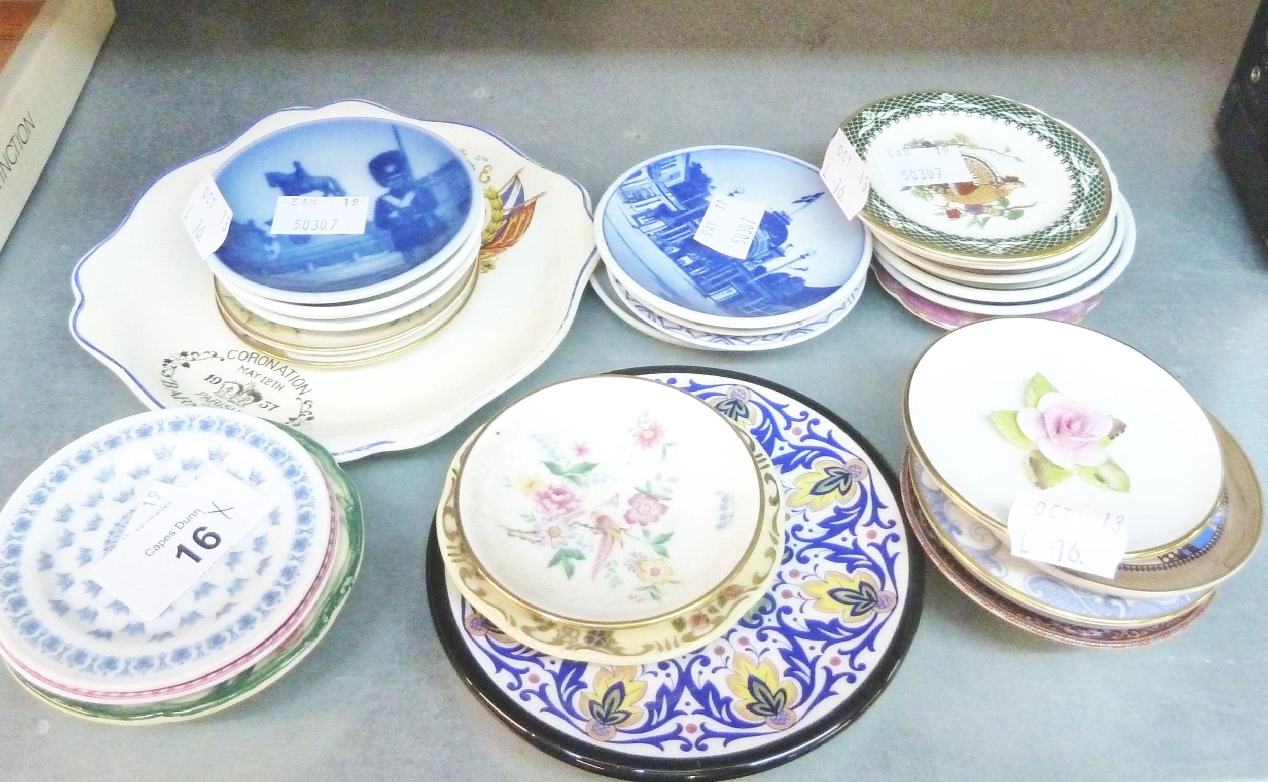 A SET OF THIRTY MINIATURE CERAMIC CIRCULAR PLAQUES, REPRESENTING DIFFERENT FACTORIES OF THE WORLD AND THE WOODEN DISPLAY SHELVES OF SIX TIERS