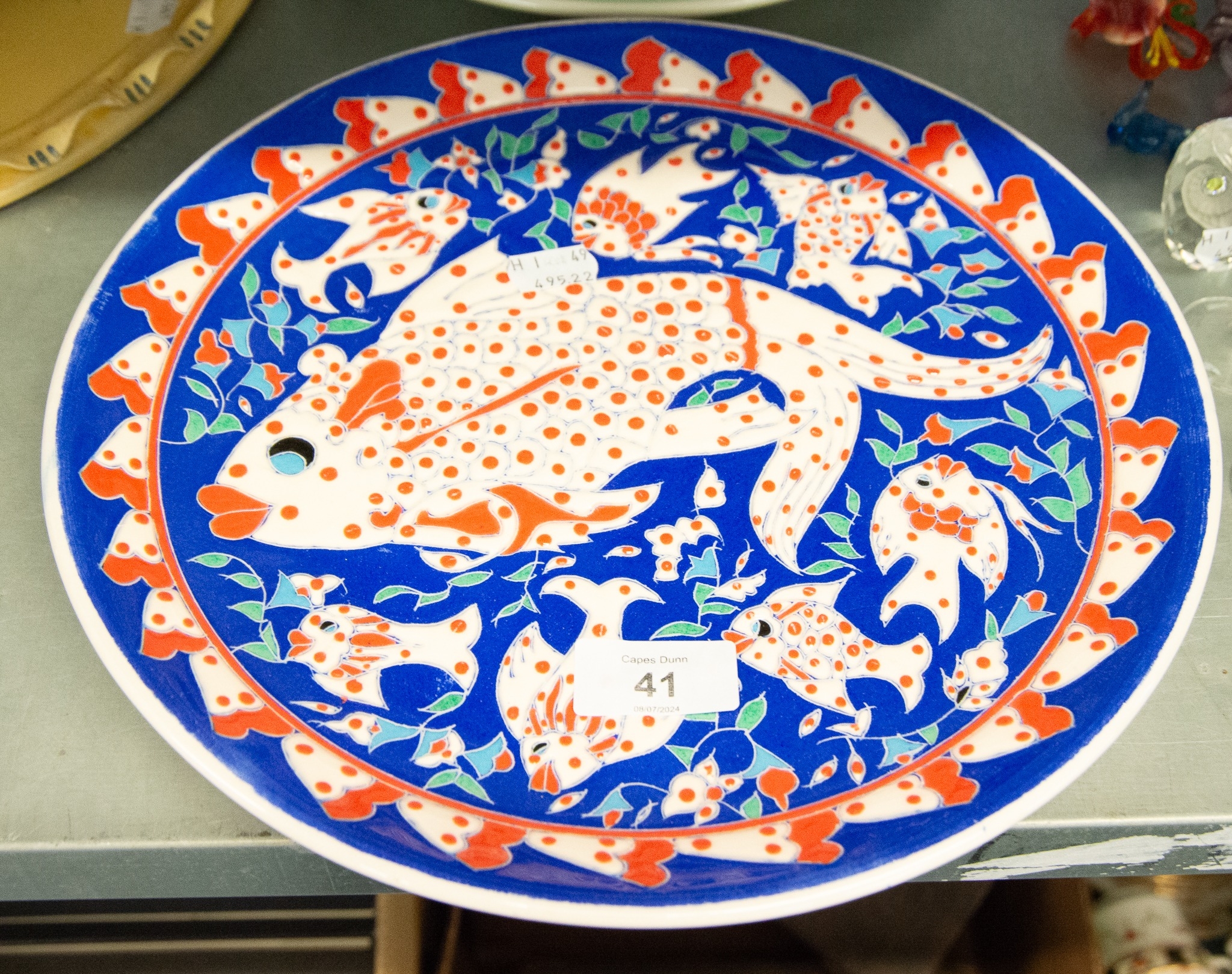 TURKISH POTTERY FISH DECORATED WALL PLAQUE, 12" DIAMETER