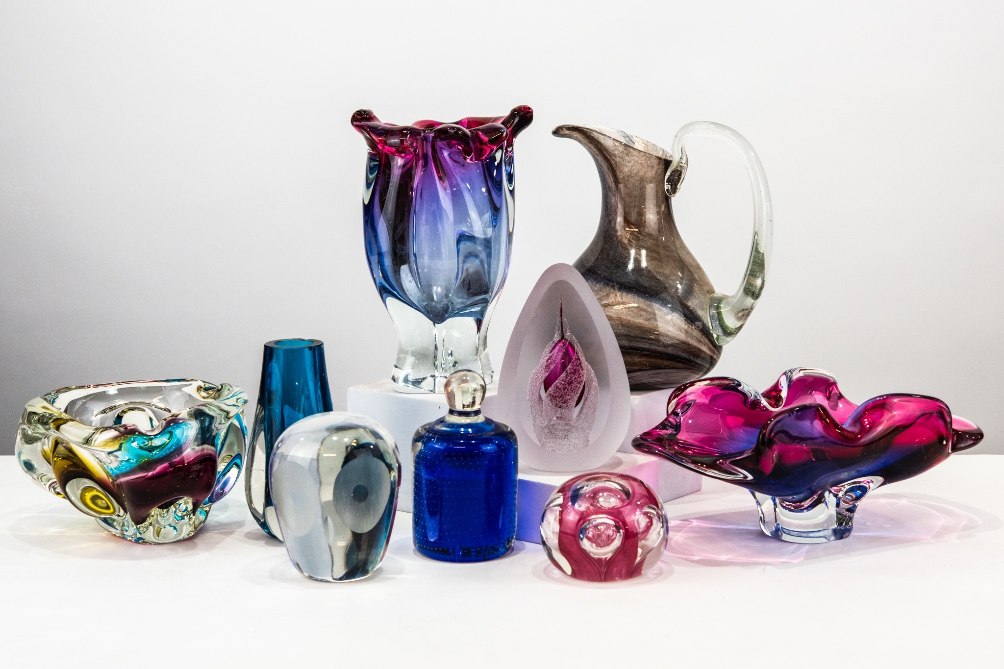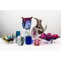 JOSEPH HOSPODKA HOT WORKED BOHEMIAN GLASS VASE, together with TWO SIMILAR BOWLS, a COLOURED GLASS JUG and FIVE OTHER, SMALLER PIECES, 7 ½” (19cm) high and smaller, (9)