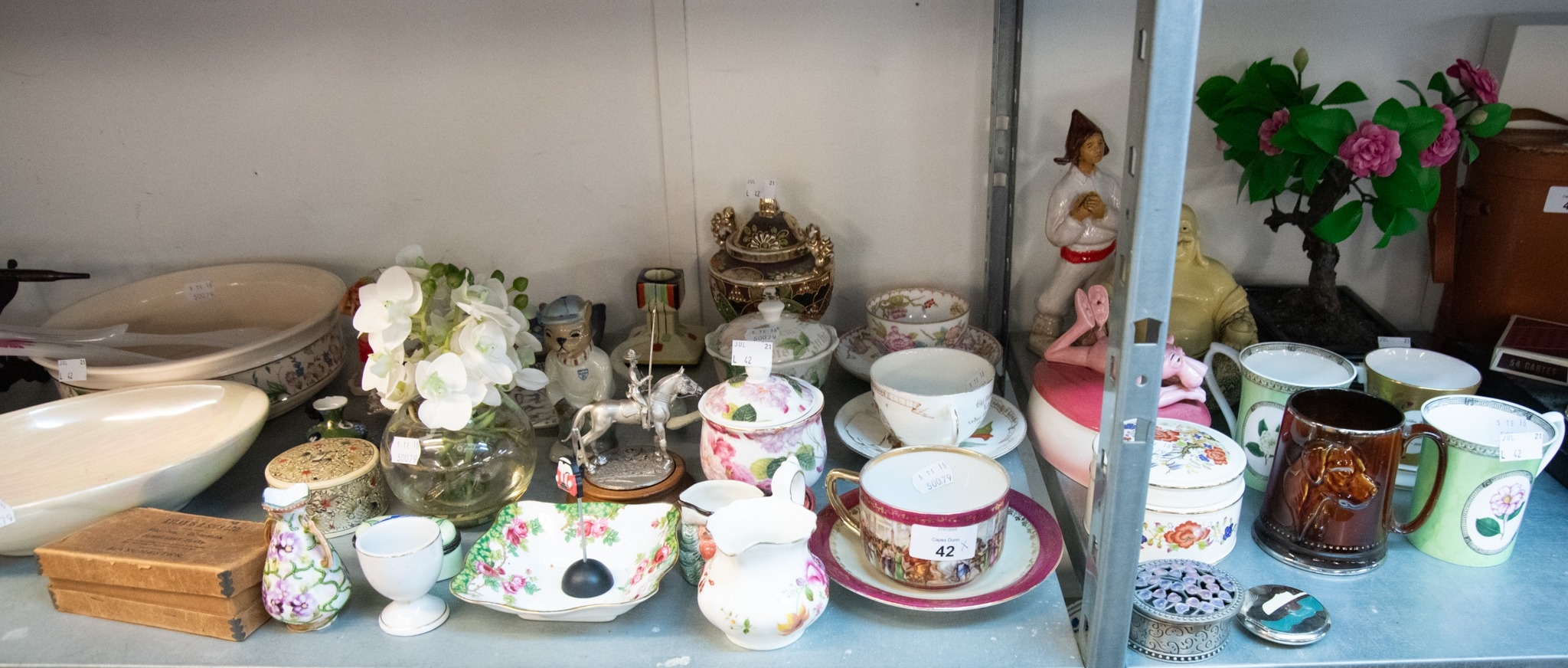 A SELECTION OF DECORATIVE CERAMICS AND COLLECTABLES TO INCLUDE - ROYAL DOULTON TEA CUP AND SAUCER, MINTON CUP AND SAUCER, PINK PANTHER COLLECTORS BOWL AND COVER, PLASTIC BONSAI, TRINKET BOWLS AND COVERS, A COMPOSITE SEATED BUDDHA ETC... (QUANTITY)