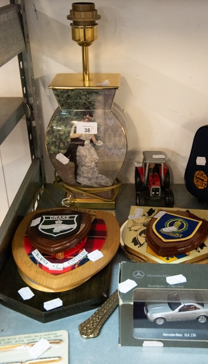 RENOIR DECORATED TABLE LAMP AND SHADE, HAND MIRROR, FIVE SHIELD SHAPE, WOODEN WALL PLAQUES, BOXED MERCEDES BENZ AND A MASSEY FERGUSON 3050 TOY TRACTOR