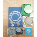 A LADY’S KIGU GOLD PLATED AND ENGINE TURNED CIRCULAR POWDER COMPACT, IN ASSOCIATED BOX AND A GREEN ENAMELLED CIRCULAR POWDER COMPACT, WITH GILD FOLIATE DECORATION