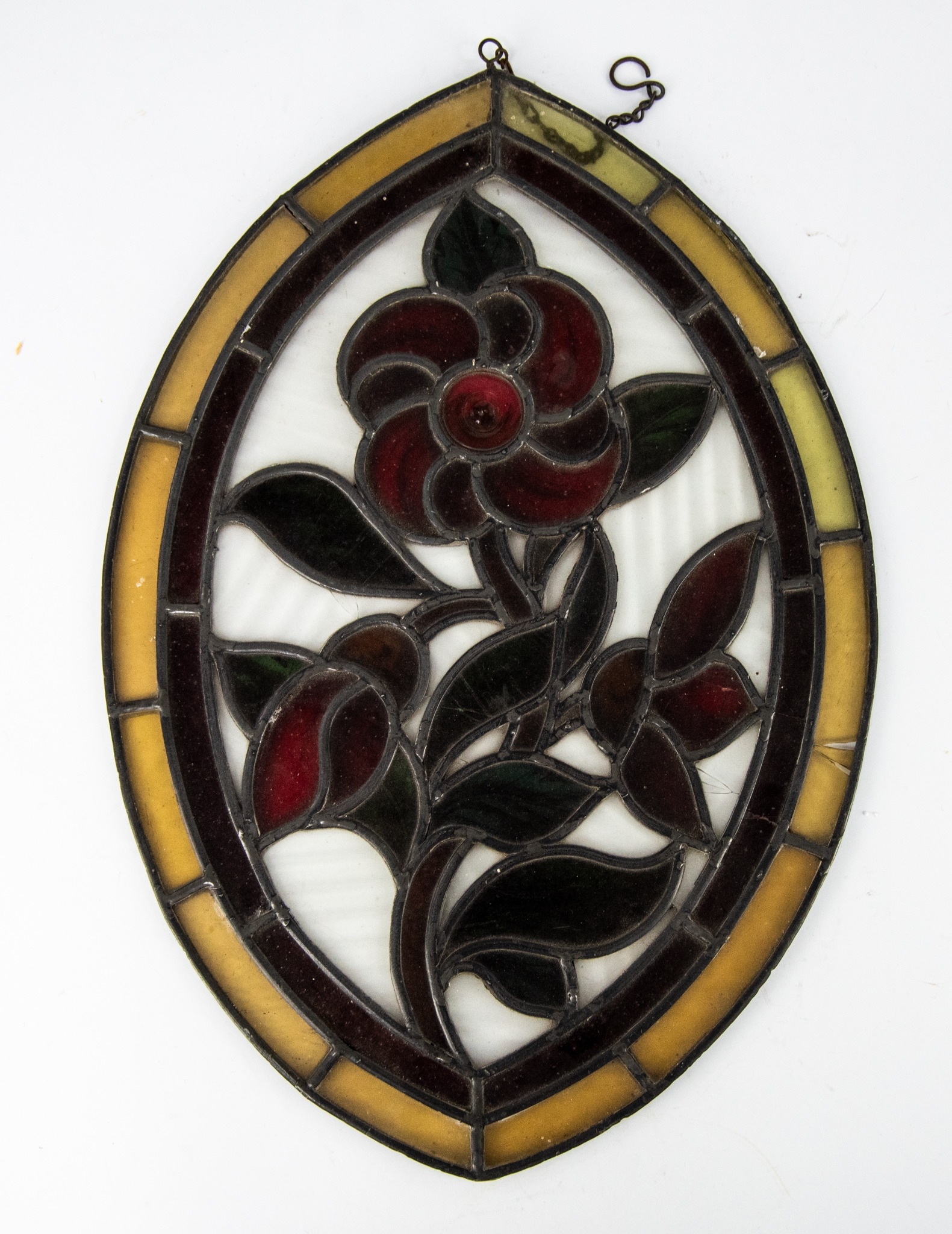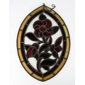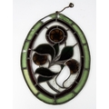 PAIR OF VICTORIAN LEADED AND STAINED GLASS PANELS, each of elliptical form, with floral designs, worked in yellow, red and green, and with small ring suspension to the top, 16” x 12” (40.6cm x 30.5cm), unframed, (2) one complete but with cracks and a loss to the border, the other with losses and cracks
