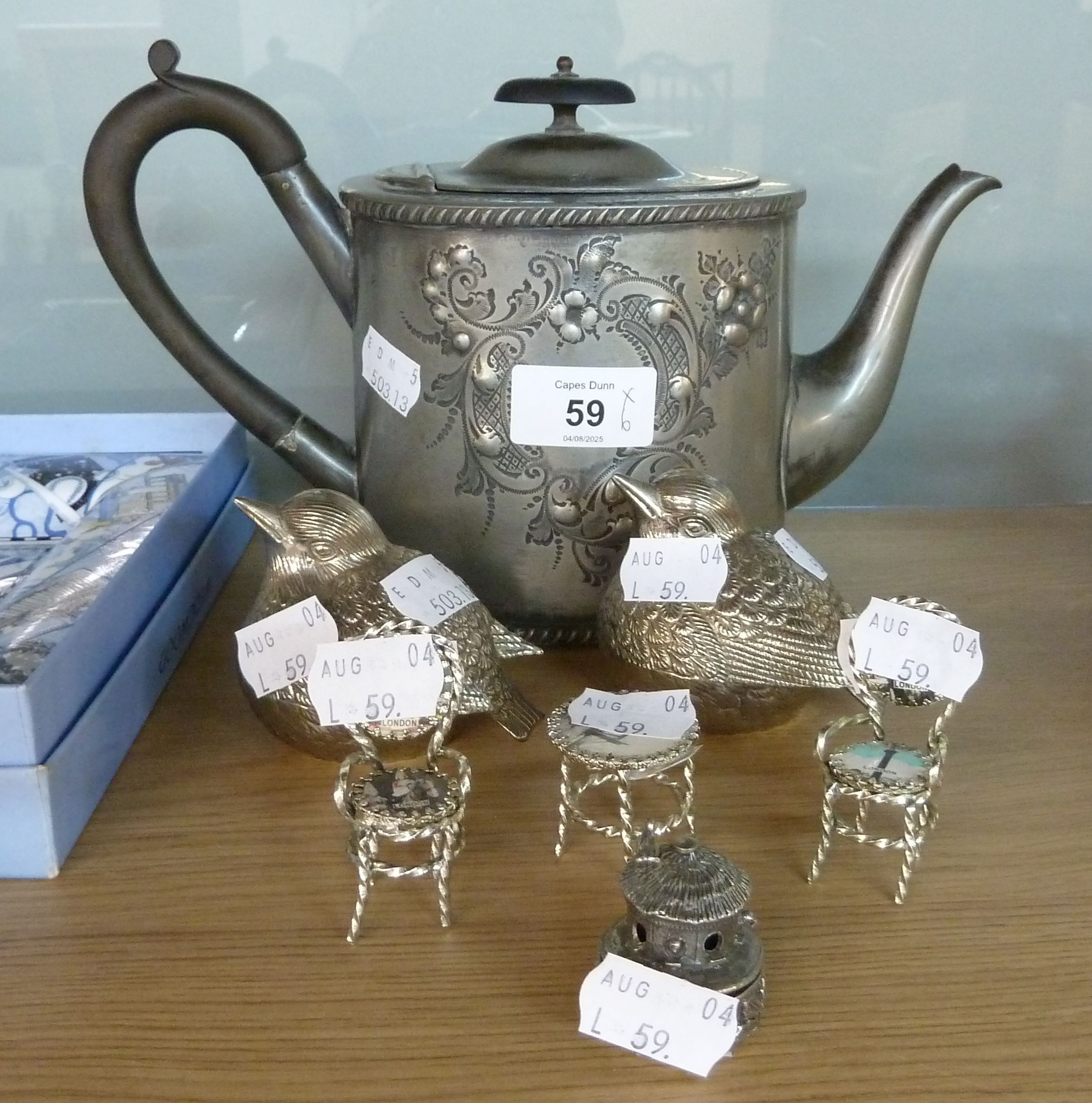ELECTROPLATE ITEMS TO TEAPOT, PAIR OF BIRD CONDIMENTS, THREE SMALL ITEMS (TABLE AND CHAIRS) (6)