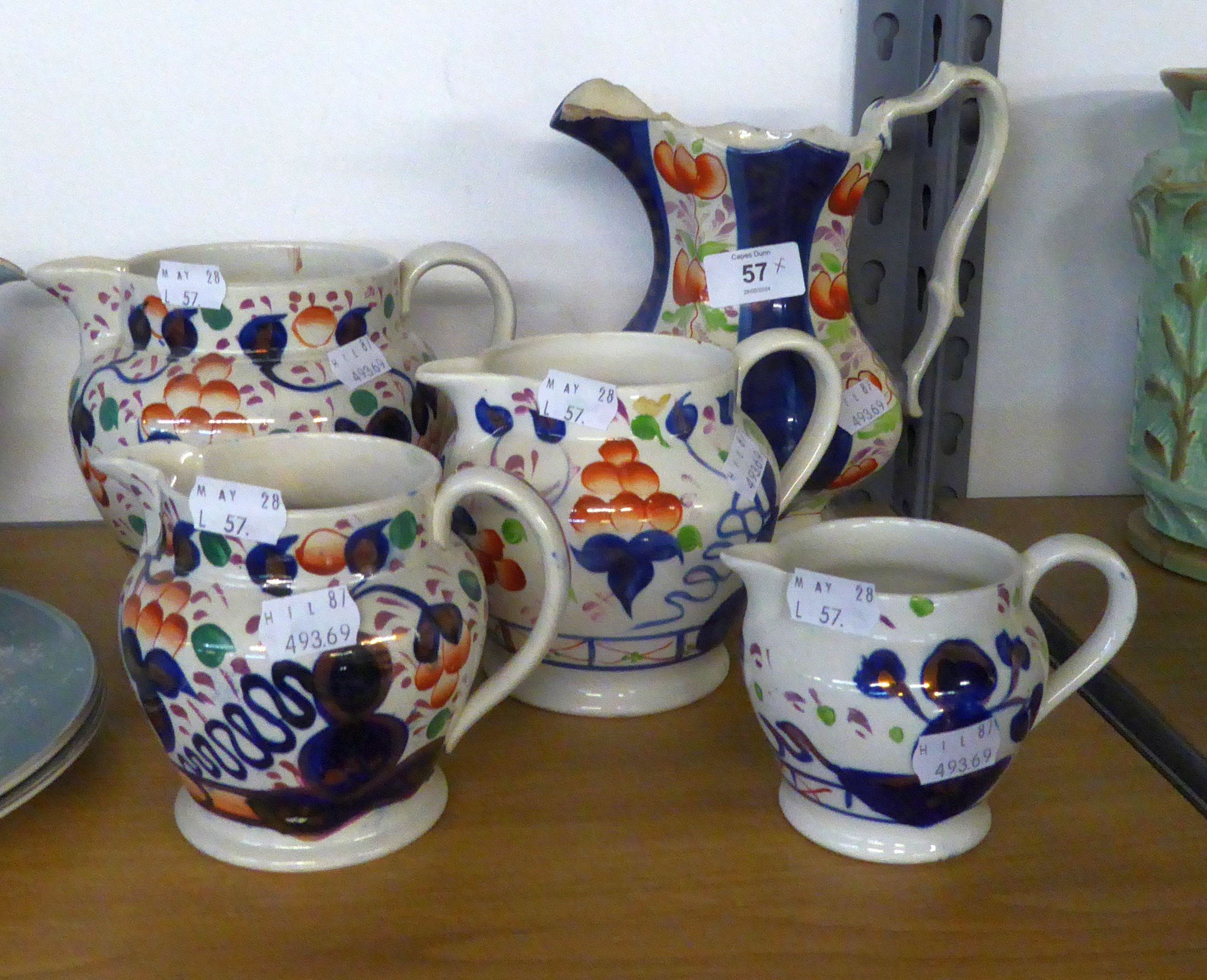 FIVE NINETEENTH CENTURY ENGLISH CERAMIC JUGS WITH IMARI DECORATION