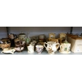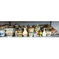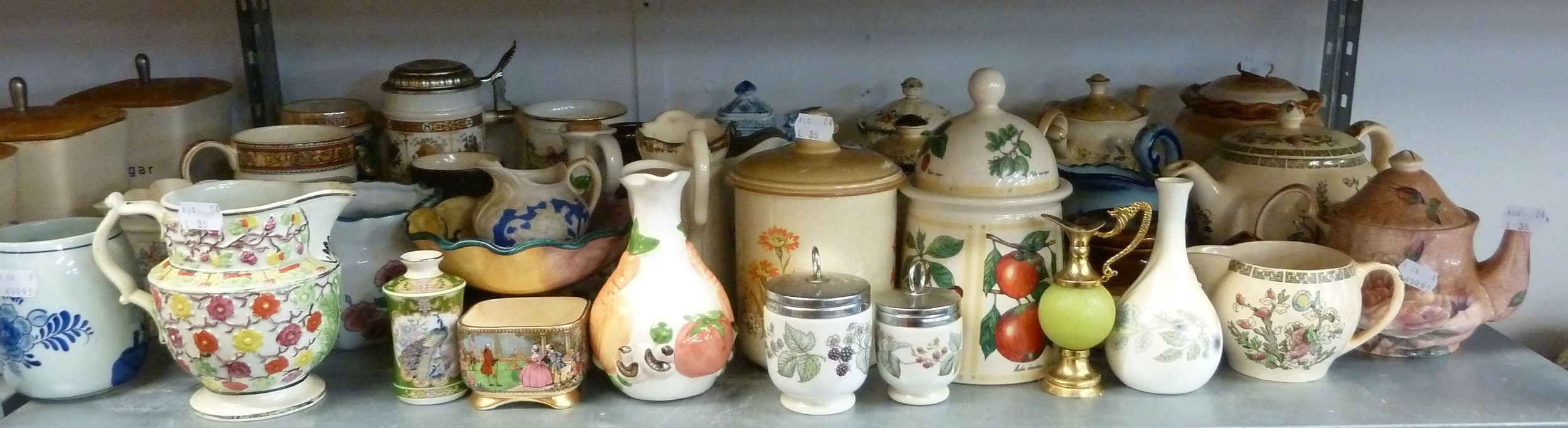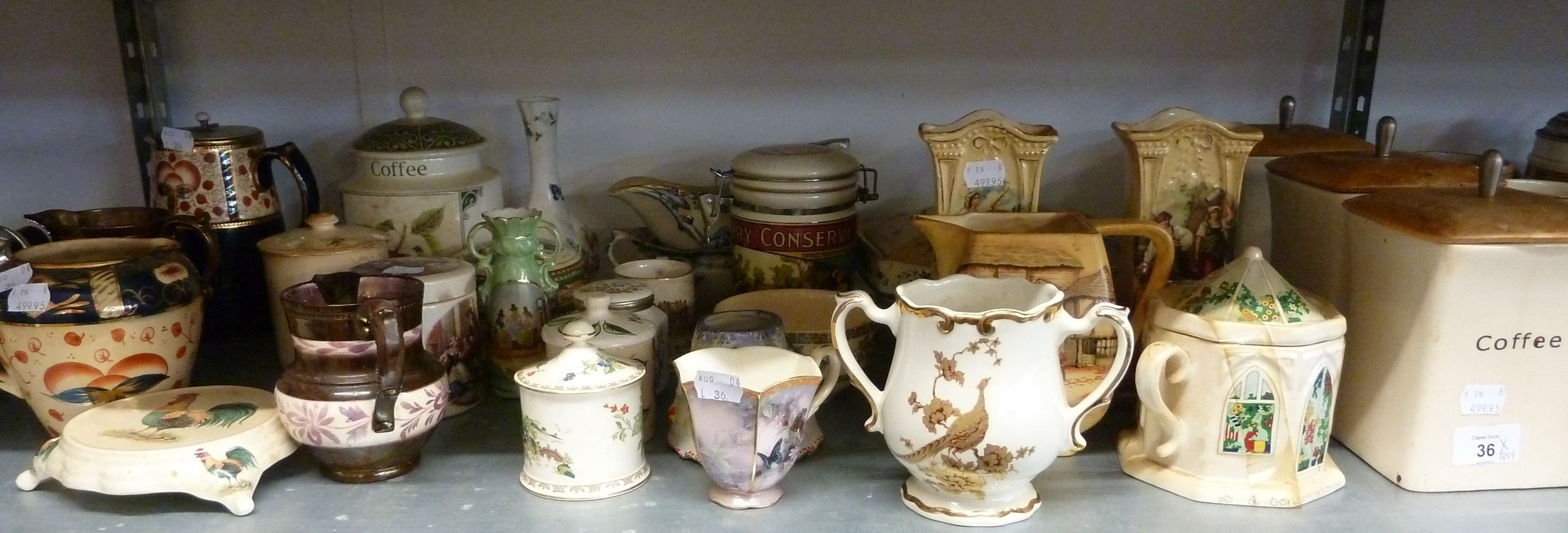 A QUANTITY OF CERAMIC ITEMS TO INCLUDE - TEAPOTS, BISCUIT BARREL, TEA, COFFEE AND SUGAR STORAGE JARS, MILK JUGS, STORAGE JARS, WATER JUGS , TUREEN ETC... (QUANTITY)