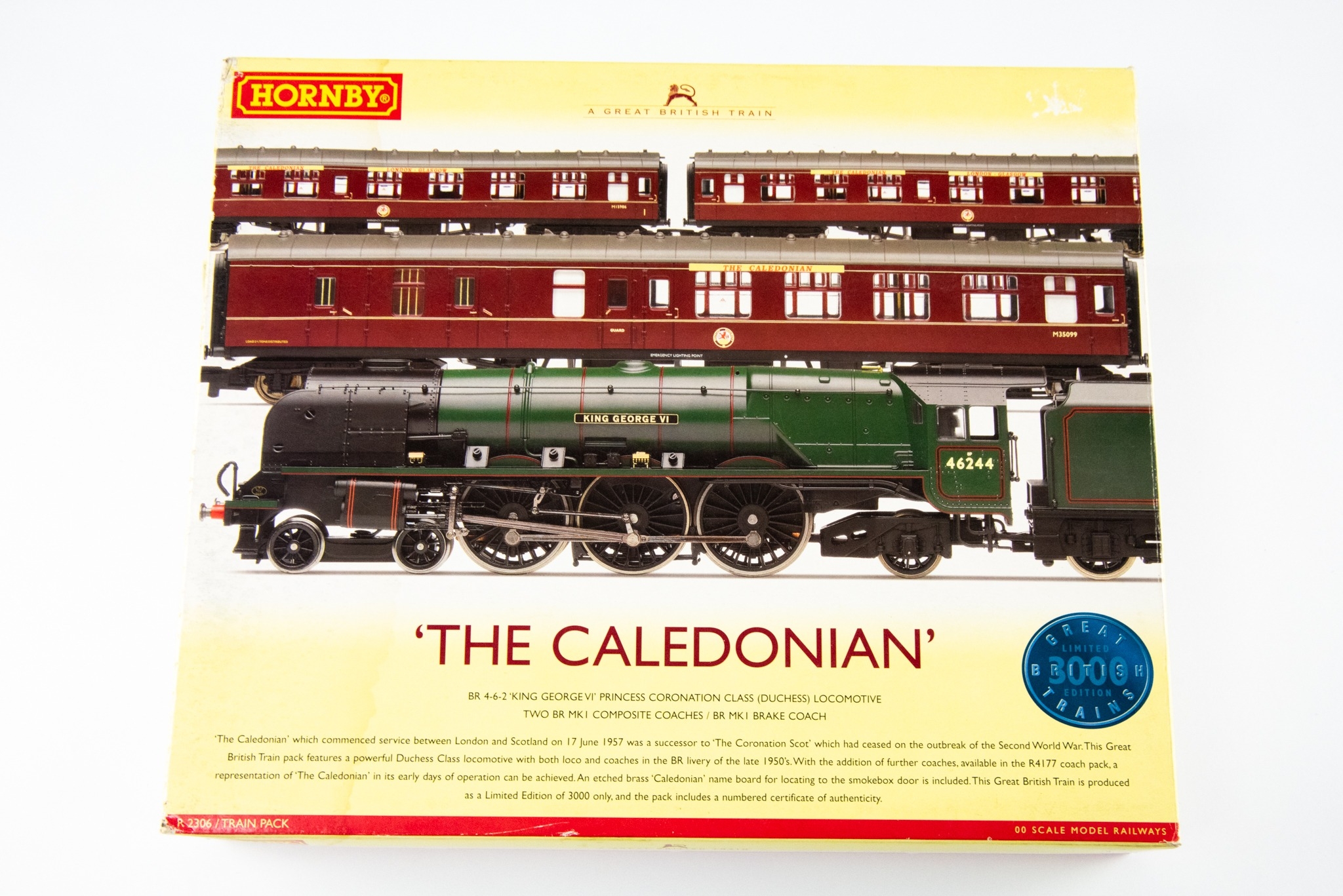 HORNBY (CHINA) MINT AND BOXED '00' GAUGE LIMITED EDITION TRAIN PACK 'THE CALEDONIAN' SET No R2306, with 4-6-2 locomotive and tender 'King George VI' No 46244 in BR green, two BR MK1 composite coaches and a BR MK1 brake coach, with tissue wrapping and certificate No 0818/3000, etc, box good
