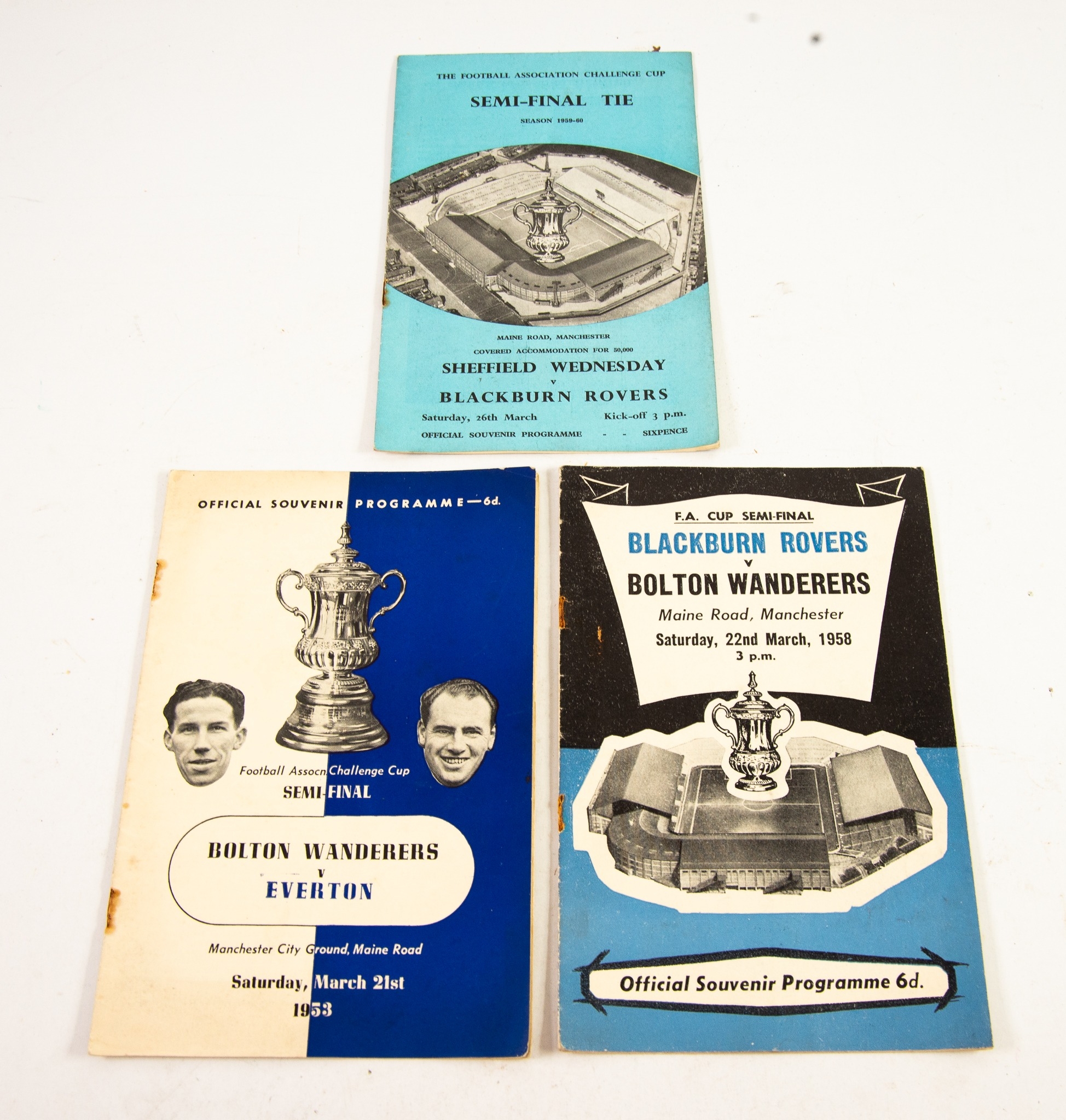 FOOTBALL PROGRAMMES: 3 SEMI-FINALS PLAYED AT MAINE ROAD 1953 Bolton v Everton, 1958 Bolton v Blackburn, 1960 Sheffield Wednesday v Blackburn Rovers