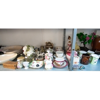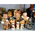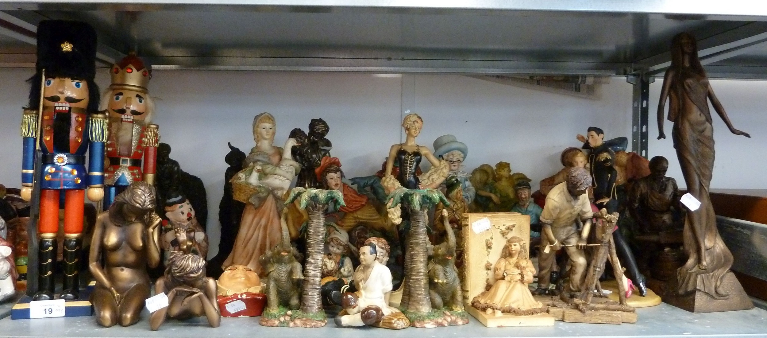 A SELECTION OF MOSTLY COMPOSITE FIGURES, TWO CHRISTMAS STYLE WOODEN SOLDIERS, CERAMIC CLOWN, ELEPHANT CANDLE HOLDERS TOGETHER WITH A SELECTION OF SMALL TOBY JUGS, BOOKENDS ETC... (QUANTITY)